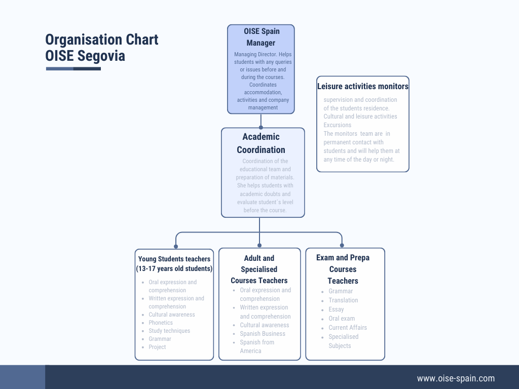 OISE Spain Manager holds a degree in Political Science and International Relations from the Complutense University of Madrid. Her career as director of OISE Segovia began in 2017 and since then she has been in charge of organising courses for OISE students, young people and adults, both general Spanish and specialised Spanish courses. She is also in charge of marketing, sales and management of the company in Spain.