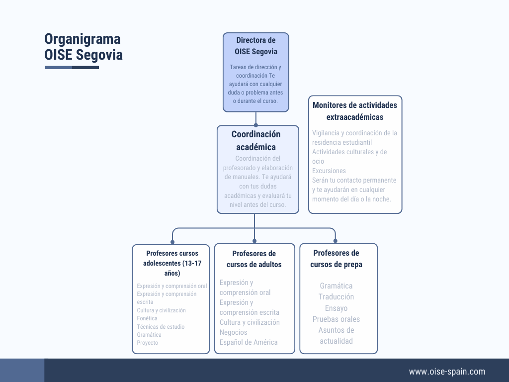 Licenciada en Ciencias Políticas y Relaciones Internacionales en la Universidad Complutense de Madrid. Su trayectoria como directora de OISE Segovia se empezó en el 2017 y desde entonces se encarga de la organización de los cursos para estudiantes de prepa, jóvenes y adultos tanto de español general como de cursos de español especializado. Además, se encarga de las labores de marketing, ventas y de la gestión de la empresa en España.